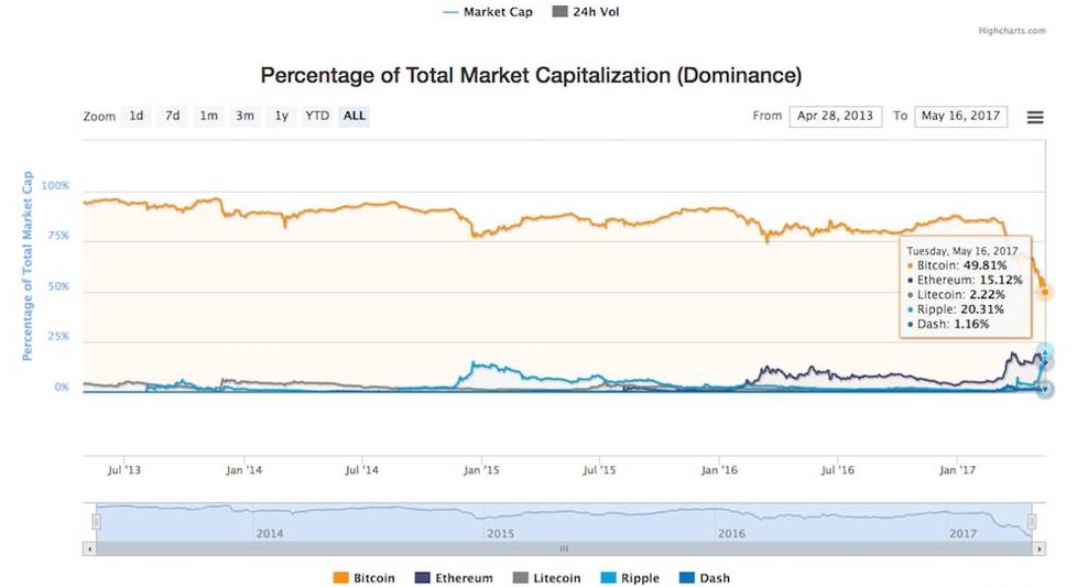 比特幣3000美元價位的壓力點6月6號市場交易已有測試。如果本周(06/12)的下跌長陰線確認,近期的價格回調應是可預期的。至於比特幣的未來是否璀璨,除了各國對區塊練技術的接受度外,虛擬貨幣之間的競爭也趨白熱化。比特幣也首次從虛擬貨幣的絕對統治地位滑落到今天49%的市場佔有率。2017新崛起的另一款虛擬貨幣Ripple已迅速搶佔了20%的市場份額,緊隨其後的Ethereum從2016年也一路攀升搶佔了15%的份額。加上另外2個更小眾的litecoin 和Dash,投機者,或是投資者的春心真的亂了…….