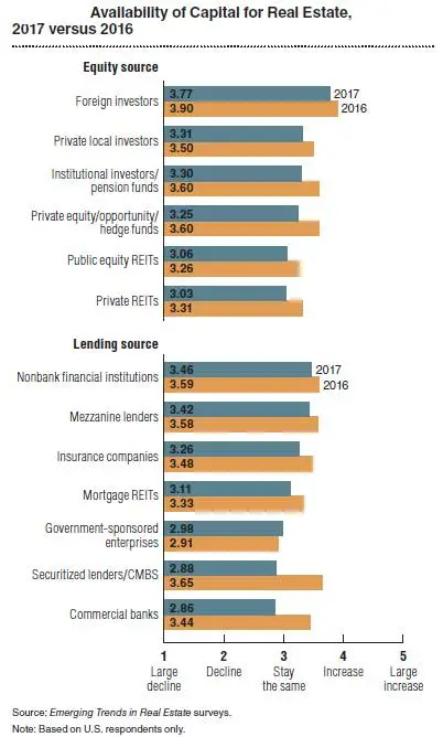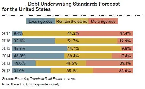 2017年美國的地產投資吸引力還是很大。但根據投資調查顯示,2017年從海外投資人到本地投資人(機構/個人),從銀行到非銀行的金融借貸機構的投資資金相比2016年均有所下降(圖5)。貸款審批預測印證了這個變化。持謹慎審批標準態度的放貸機構從2016年的129.%增加到了今年的47.4%(圖6)。讓投資者注意到了逐漸走高的價格並轉趨保守謹慎。本次的復甦和危機前完全不同,目前地產市場貸款的審批標準要求較嚴格,和上次那種不可持續的飆漲截然不同。數據顯示,申請的融資貸款要求嚴格和極低的庫存量讓供給與需求失衡。目前看,至少在熱點地區短期不會改善。