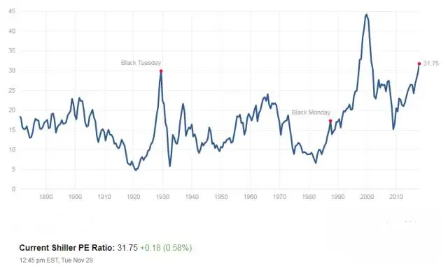 (本文寫於11月末,美國大規模稅改已於12月通過)。市場對稅改和大規模基建刺激的期待,低利率外加走強的就業市場,高科技加速度的更新換代等眾多因素推高股市,摩爾定律再過幾年都不適用了,科技進步的速度讓我眼暈。但復甦時間越長,市場就越不放心。目前美國短期國債和長期國債的收益差已收窄到0.59。歷史上這種反向的曲線趨勢(短期收益高過長期)和衰退有若干聯繫(見圖 1),以Robert Shiller 周期性調整市盈率CAPE來看,目前的31.75是2000年科技股泡沫以來第二高位(見圖2)。
