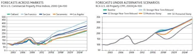 西海岸在投資需求方面保持強勁,從最北面的西雅圖,波特蘭,舊金山,洛杉磯一路到橙縣,聖地亞哥全部搶手。中部有差一點的奧斯丁和達拉斯,而東岸紐約(曼哈頓)還是首位。目前看地產漲勢還在繼續,在沒有任何黑天鵝,灰犀牛,蝴蝶效應等時髦動物出現下,穆迪(Moody)給出了樂觀的後期預測(見圖8)。