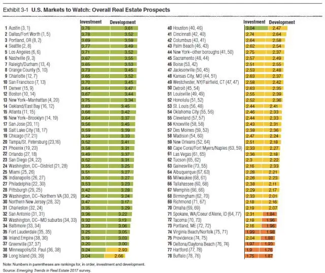 隨著價格成本的走高,收益在不斷地下降。地產幾年來的收益讓炒作的氛圍更為濃厚,我現在微信朋友圈裡的地產投資大師幾年間增加了3倍,形勢一片大好。全美似乎都有不錯投資的機會,但職業商業地產投資人認可以下地區(見圖7,投資/開發),衡量標準是區域經濟發展速度或在物流鏈的所處位置等諸如此類,沒提朋友圈。