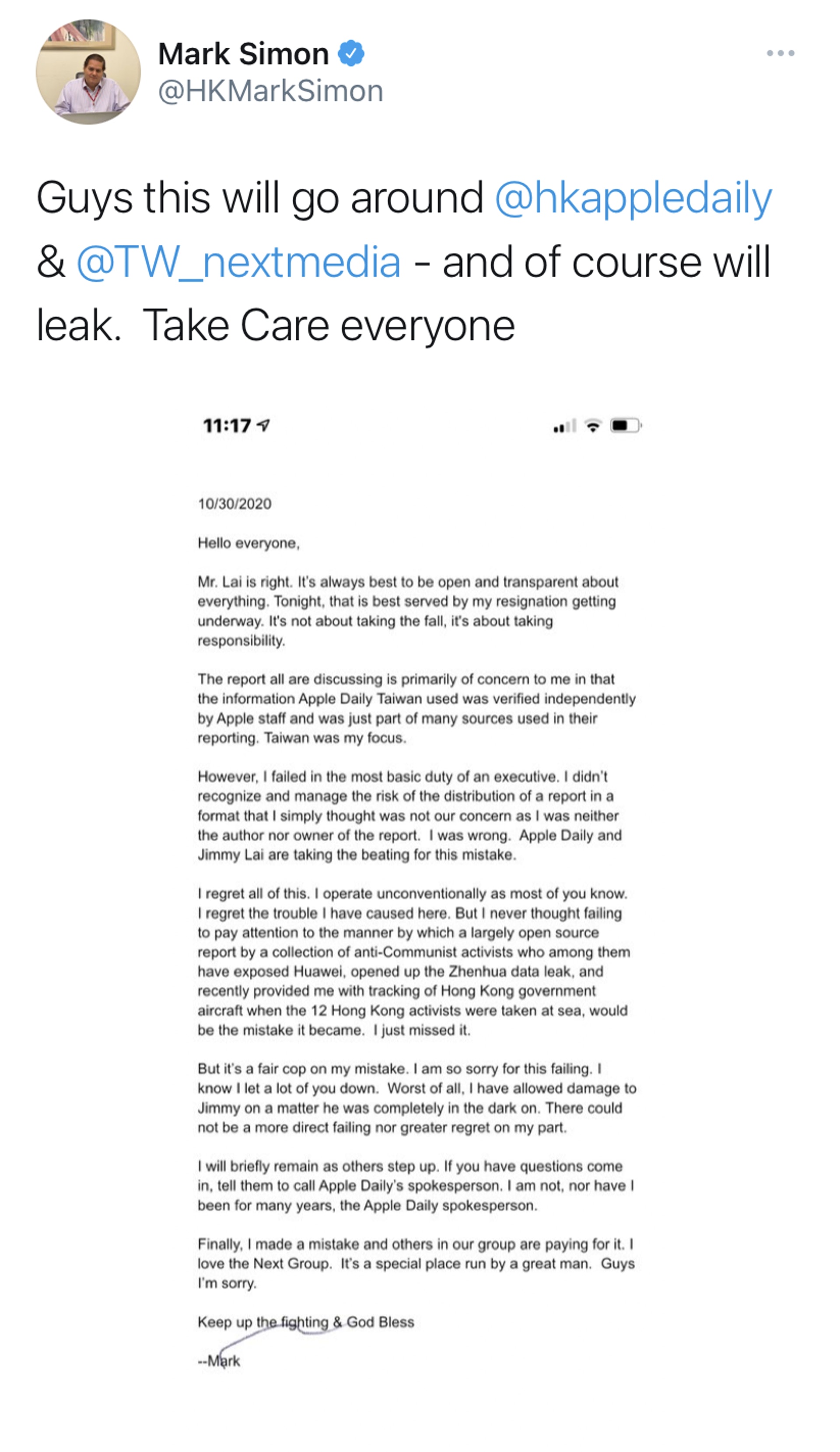 Mark Simon晚上在個人twitter上承認涉事,並就事件致歉及宣布辭職(Tonight, that is best served by my resignation getting underway)。他形容對事件感到後悔,但重申自己很多年前已不是《蘋果日報》發言人。