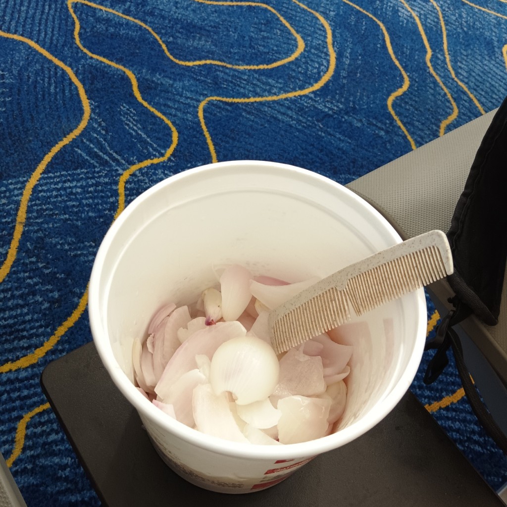 發現香港機場的登機口區有開水。我把帶的三個洋蔥燙熟了吃,挽救了我的三個洋蔥,否則我只能把它們扔掉。因為生洋蔥太難吃,生洋蔥超過了我忍受的限度。