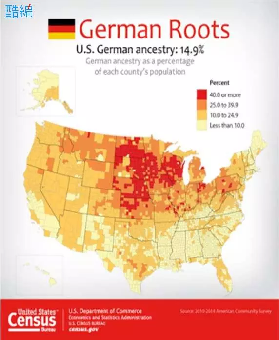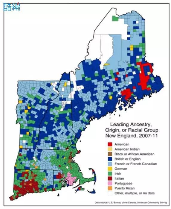 「為啥只有亞裔有細分」是聽得最多的一個質疑,屬於典型的偽問題。聯邦和民間機構針對歐洲白人和拉丁裔內部各個子群體的統計都是公開的,隨手一搜就是大把,從基於聯邦「美國社區問卷"American Community Survey做的德裔在美分布圖 (參考圖一:美國聯邦政府根據美國社區問卷做的德裔分布圖;圖二:聯邦繪製的新英格蘭族裔分布圖,包括了白人和拉丁裔的細分條目但沒有亞裔和黑人的細分),到普查中的拉丁裔內部墨西哥裔、古巴裔和波多黎各裔細分問題,不勝枚舉。