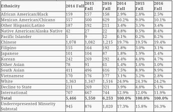 「細分后苗裔娃會搶我娃上學名額」是另一理由。不說伯克利是否錄一苗娃就會少錄一華娃(全加州只有九萬苗裔,而華裔有一兩百萬),也不說強勢族群是否有扶助弱勢族群的義務,也暫不說大學搞種族配額早已被裁違憲這一事實,只強調一點:加州大學系統早已有族群細分數據,州立法搞不搞亞裔細分人家都知道華裔相對其他族裔成就如何。表一給出伯克利新生入學族裔細分數據,從中可見墨西哥裔是從其他拉丁裔中細分出去單獨統計的,而華裔韓裔也都早就有自己的單列條目。