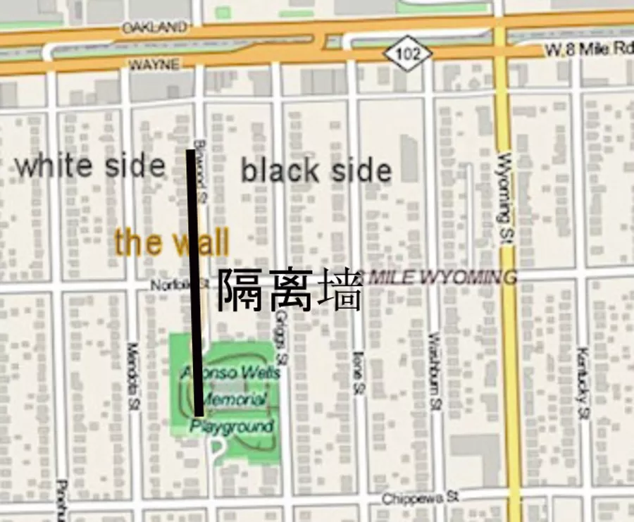為了能夠拿到貸款,開發商想出奇招——沿著Farmington區Birwood街建起了一堵800米長的水泥隔離牆。將來要建設的白人專屬小區位於牆西,幾戶黑人則被擋在牆東。