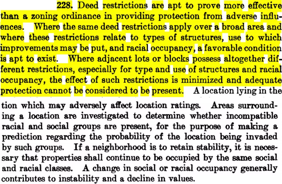 但有色人種卻不能同樣在白人社區內購房。因為住房署擔保手冊內說的清楚,白人社區一定要防止「不和諧種族」入侵,否則不予單保——失去聯邦擔保的後果是房價暴跌。在如此明顯的政策信號驅動下,各白人社區普遍採用了帶有種族限制條款的房地產合同。具有這類條款的社區又會在住房署的評級中獲得加分。例如1936年住房署擔保手冊中提到: