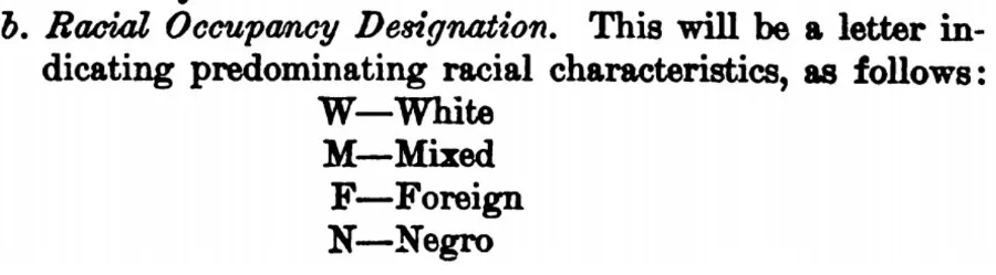 例如,1938年住房署指導手冊1850(b)款中,要求調查員彙報各社區種族構成。分為白/混合/外國人/黑人 四類,用W/M/F/N分別標出。