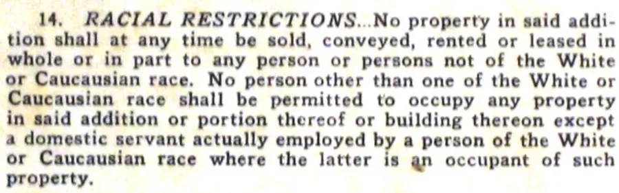 「種族限制:前述範圍內任何房產的全部或部分,均不得被轉賣、贈送、出租給白種人(高加索人種)外任何人。除白種人(高加索人種)外任何人均不被允許入住前述範圍內任何房產的全部或部分,居住於有關房產內白種人(高加索人種)所雇傭僕役除外。」