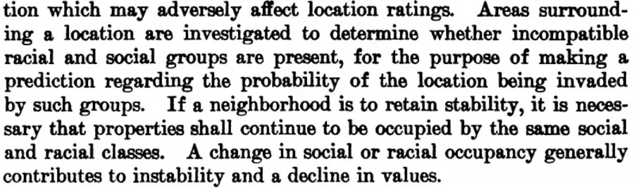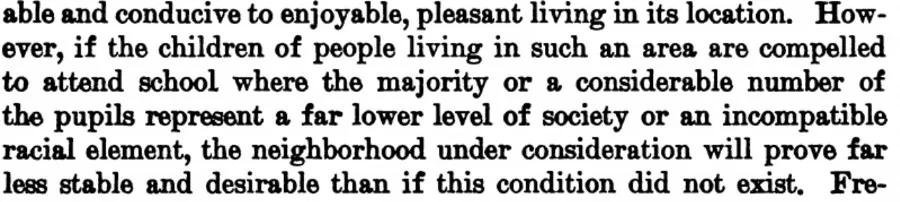 「然而,如果該區域住戶的子女被迫去大量學生來自社會等級低得多的階層或者不和諧種族的學校入學,該社區將遠不如沒有這種情況的社區穩定和可欲。」