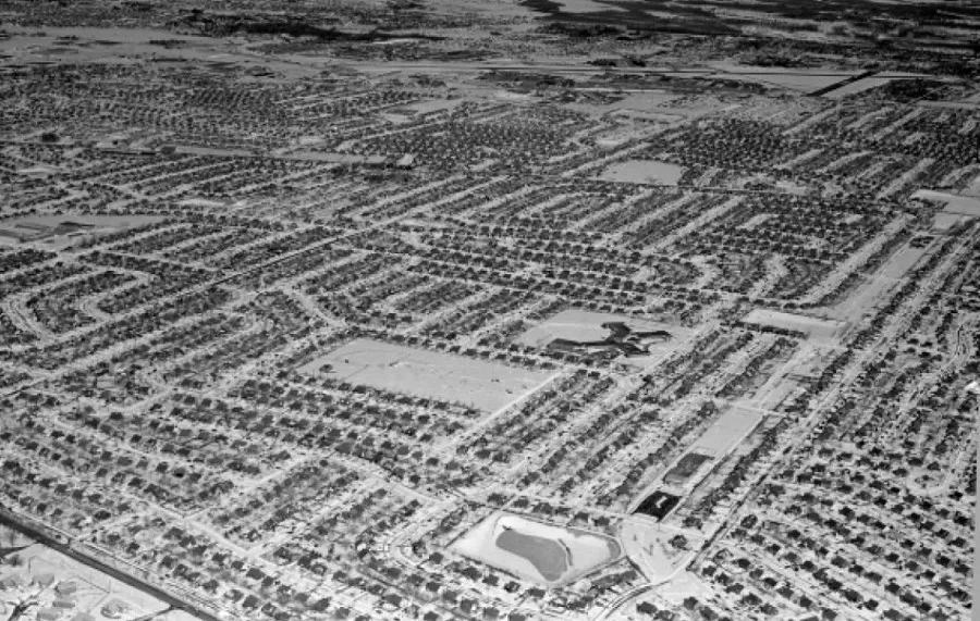 二戰後美國郊區化過程大大加速。原因之一是在二戰臨近結束之時,美國國會通過了著名的《退伍軍人安置法案》(「G.I. Bill」)。該法案涵蓋廣泛,為退伍軍人提供上學就業等方面的優厚待遇。其中最重要一點,就是由新建立的聯邦退伍軍人署以美國國家信譽為退伍軍人提供零首付房貸擔保。
