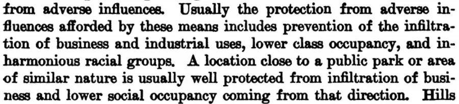 「一般來說,這些(地形)條件能阻擋各類負面因素的滲透:工商業,下等社會階層,不和諧種群。如果社區靠近公園或類似區域,將有效阻擋商業和下等社會階層從該方向的入侵。」