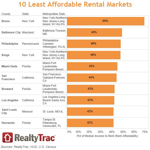 高昂的房租使邁阿密成為美國相對租金最高的城市之一,根據Zillow網站的統計報告,邁阿密平均房租佔一般家庭年均收入的43.8%,一般情況下房租和收入比應該在25-30%之間,由此可見邁阿密一般家庭難以負擔如此高的房租。根據RealtyTrac統計,邁阿密地區被列為美國十大最貴房租城市之一,排名第七。而在房租上升幅度最快的北美城市中,邁阿密去年被Apartmentlist.com列為第二名,僅次於加拿大的溫哥華。