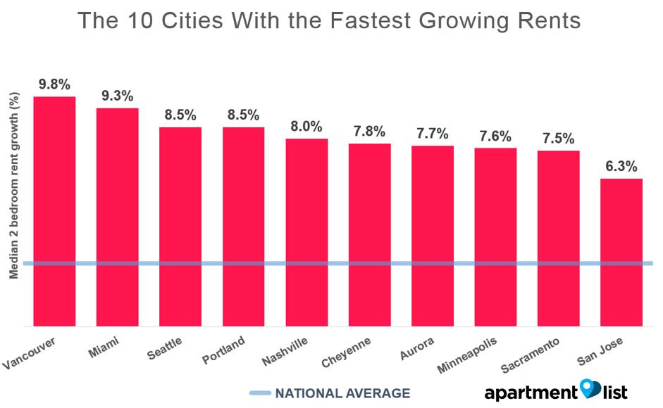 從去年底到今年4月,邁阿密大部分地區房租急漲,許多房屋租金都上漲了百分之十,儘管如此,市場上的出租公寓還出現供不應求的情況,目前在邁阿密中等地區的2房2衛公寓租金已經上漲到$1400-1500。地區比較差一些的2房2衛公寓房租也漲到$1200-1300。