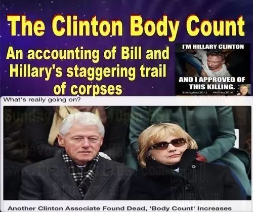 有陰謀論說她和柯林頓多年來秘密暗殺了很多對自己不利的人,甚至有人建立了一個「查屍體」網站,專門統計和希拉里有關的離奇死亡,現在數字已經超過90個了。