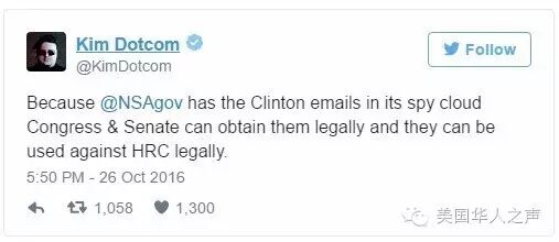 戲劇性的變化發生在三天前。10月26日,超級黑客Kim Dotcom發推,說他知道希拉里被刪除的郵件在哪裡。更牛叉的是他知道如何用絕對合法的方式得到!
