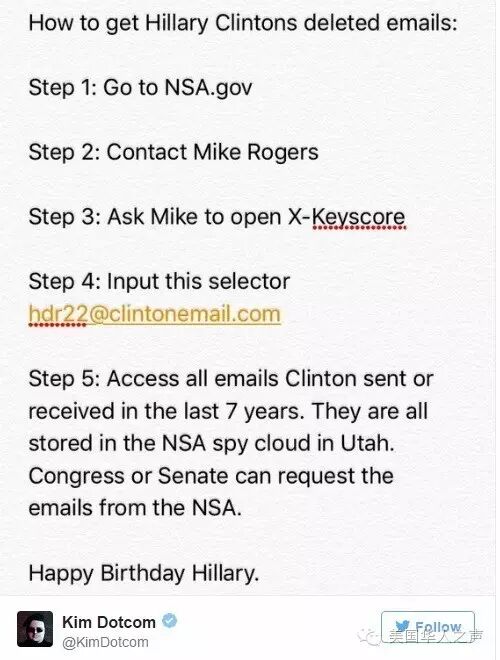 一開始人們覺得這傢伙在海吹,並沒有當回事。 誰曉得希拉里生日的那天的2點42分,Kim Dotcom 再次發推明確指出被刪除的郵件在猶他州的NSA的spy cloud上,並告訴人們如何去找到那些郵件: