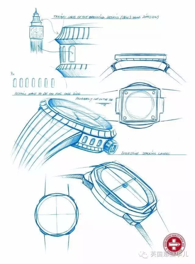 從設計圖中你可以清晰看到設計師「方中有圓」構思過程,圓形表圈象徵大本鐘,方形錶殼代表鐘塔和圍著鐘面的四個稜角。錶帶上的拋光條也正代表著大本鐘鐘塔上的洞孔,每一天重達13.5噸的大本鐘鐘聲透過這些洞孔響徹倫敦。