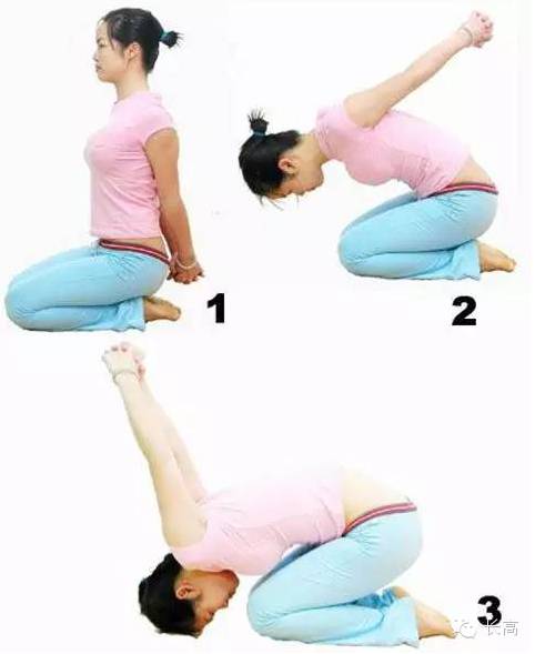 5.吸氣,雙手都向身體後方伸展,由此借力向上挺胸,保持30秒,自然呼吸,慢慢地恢復原來的姿勢。