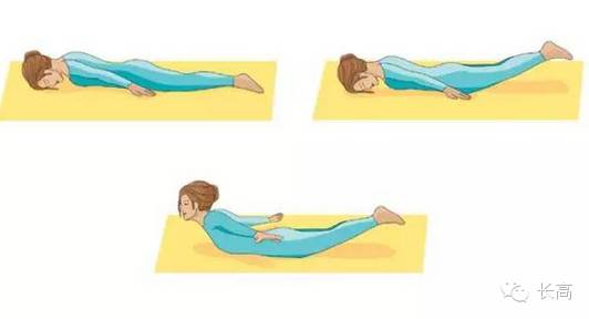 呼氣,頭、手、胸,同時離地,盡量抬高;