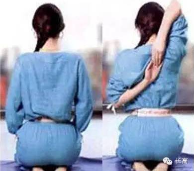 如果無法將手掌放近胸椎﹐可藉助左手將右手手肘拉近背部中央。