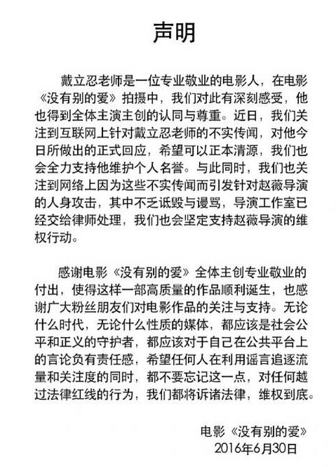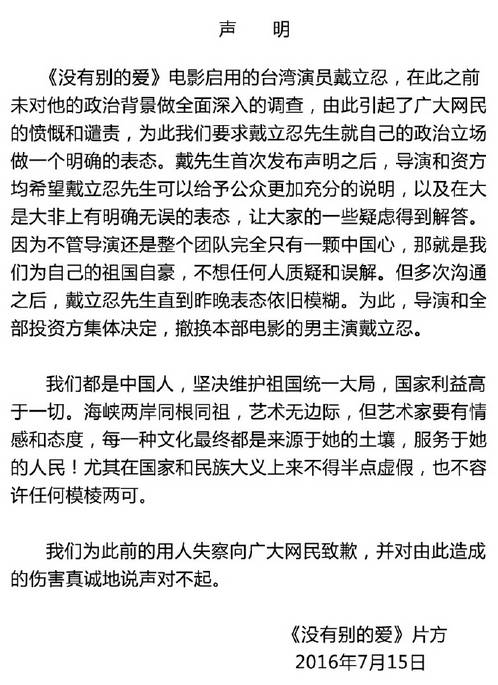 7月15日,趙薇新片《沒有別的愛》官方微博@沒有別的愛movie 針對「啟用台獨演員戴立忍」一事發表聲明,稱戴立忍表態模糊,導演趙薇及投資方集體決定,撤換男主演戴立忍,就此前用人失察向廣大網友道歉,並強調,堅決維護祖國統一大局,國家利益高於一切。