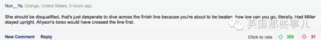 「我以為是要腳著地,哪個胸部先撞線算哪個贏啊,如果她想要做這種跳水動作直接去參加跳水項目好了啊,這樣衝刺不應該被允許!取消獎牌!」