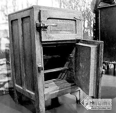 而到了明清時期,中國古代已經有了由冰鑒演化而來的木胎制的「冰箱」。這種冰箱是用天然冰塊降溫的箱子,以高級木料製成。從外觀上看,冰箱口大底小呈方斗形,腰部上下箍銅箍兩周。箱兩側有銅環,銅環的用途就是便於搬運。箱口覆兩塊對拼硬木蓋板,板上鏤雕錢形孔。