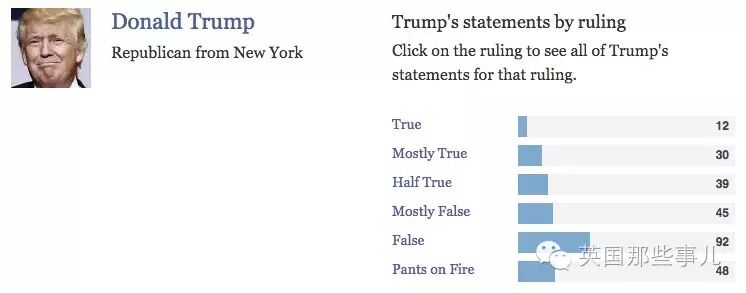 川普更誇張,他所有的宣稱中,只有12條是真的,剩下有39條半真半假,45條幾乎為假,92條完全為假,48條假的離譜。