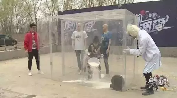 用鼓風機把麵粉吹起來,遙控開啟電子打火器,結果亞克力箱瞬間爆炸。