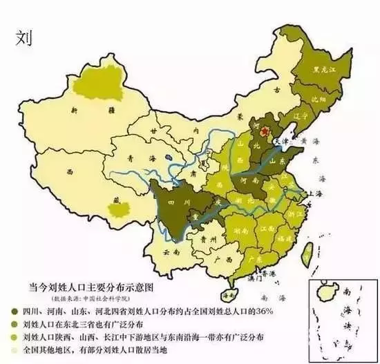 知名人物:漢高祖劉邦劉姓,最早一支劉姓源自堯的後裔劉累,故劉累為劉姓得姓的始祖。劉姓建立了西漢、後漢、南漢等政權。到2013年有人口近7000萬,佔全國人口的5.34%,在王、李、張之後排第四位。河南、河北、山東、重慶、四川等地是劉姓人口的集中地。