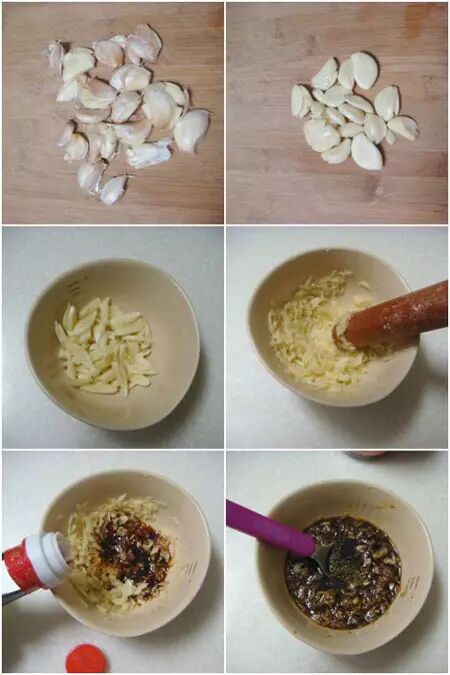 6大蒜用刀壓扁。剝去蒜皮。稍切一下後放小碗里。用擀麵棍搗成蒜泥。倒入醬油、香醋,少許香油和辣椒油。一碗香噴噴的蘸汁就調好了。