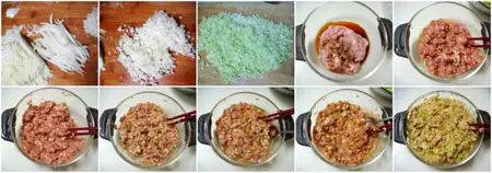 大白菜洗凈后控凈水分,先切成絲。再切成末。撒上少許鹽用手揉搓,然後用手撰擠出水分。用紗布也可,我嫌麻煩,直接用手。肉餡中放入料酒、醬油等液體。再一點點放入擠出的白菜汁,邊倒邊用筷子朝一個方向攪打。攪打上勁即可。