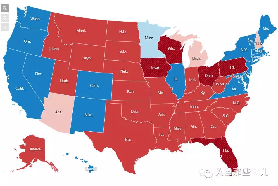 川普幾乎一個不差的,順著這條很窄的路,拿下了這一個一個的搖擺州...
