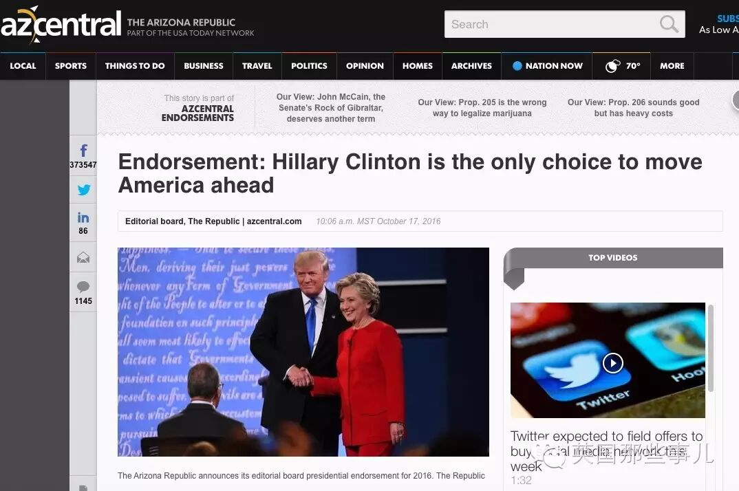 在支持了共和黨126年後,《亞利桑那共和報》今年罕見的站在了希拉里這邊 [背書:希拉里是讓美國前進的唯一選擇]