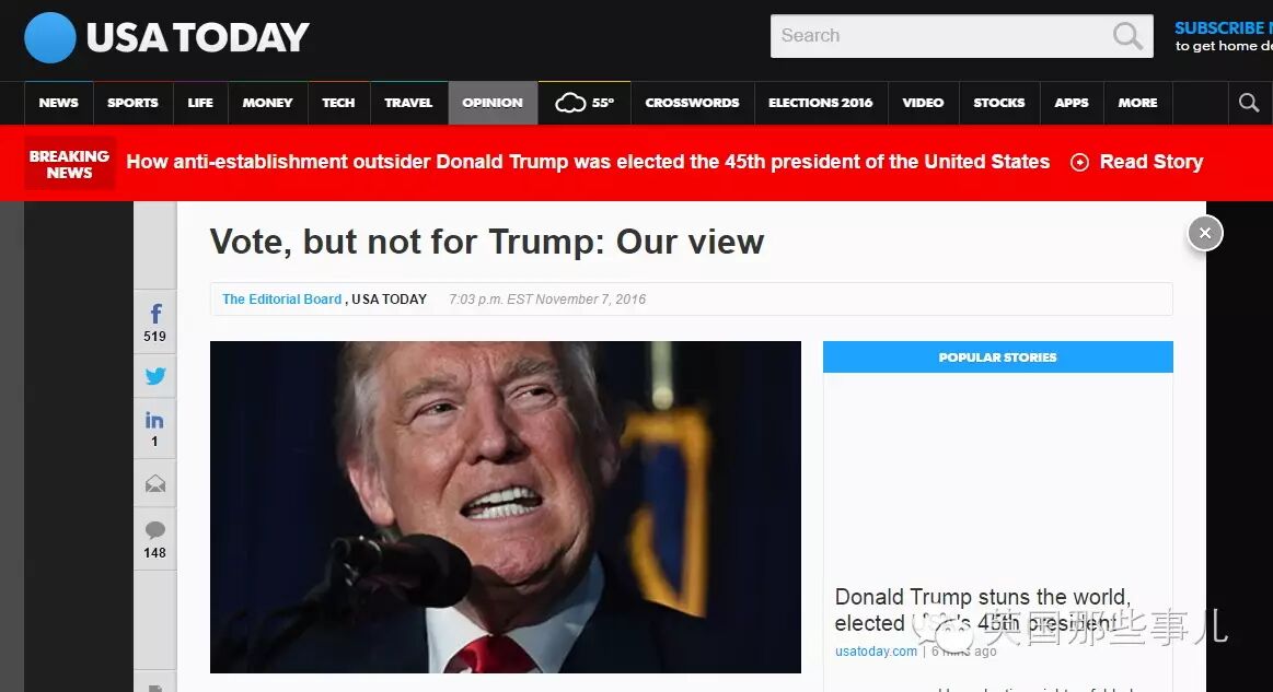 美國銷量第一的《今日美國報》曾公開呼籲美國選民不要投票給特朗普。