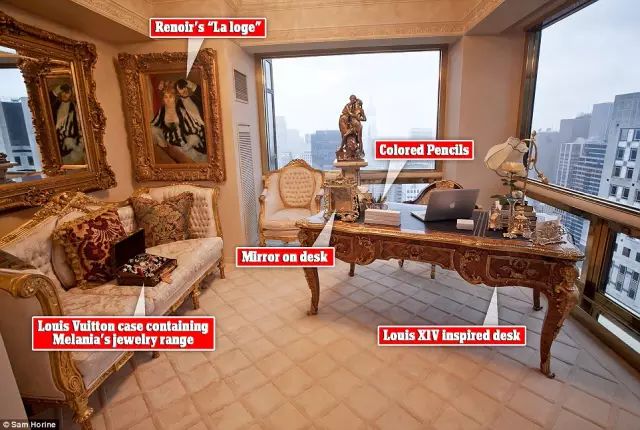 ▼老婆的辦公室。沙發上擺一個LV的箱子,裝的什麼?往下看……沙發邊掛著印象派畫家雷諾阿的名作《包廂》,不過是複製品。桌上的彩色鉛筆可能是特朗普兒子畫畫用的。