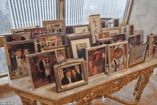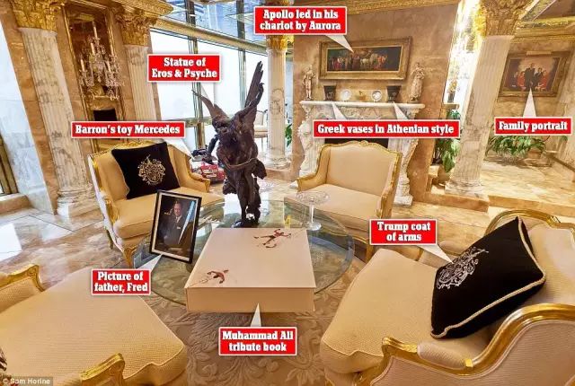 ▼古典藝術充斥房間,客廳放著愛神和賽姬的青銅雕塑,壁爐上掛著黎明女神歐若拉引領太陽神阿波羅的油畫,一旁的全家福里,畫著特朗普的父親以及兄弟,桌上還有一張特朗普父親的相片,邊上是一本價值15000美元的有關美國知名拳王穆罕默德·阿里的限量版精裝書。