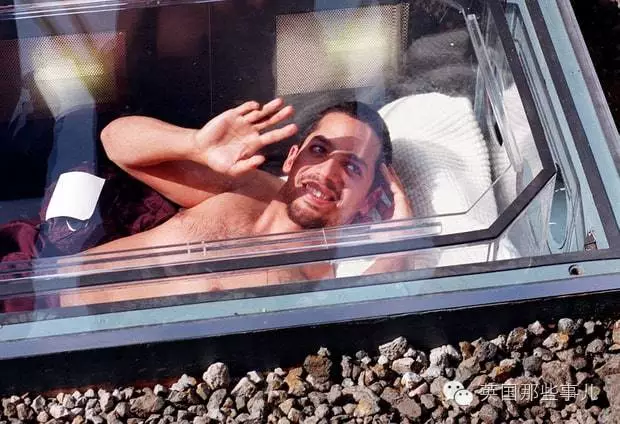 當時附近的英國人, 在旁邊的草地上聚餐,圍觀… 甚至還有人開著直升飛機往玻璃盒子上扔芝士漢堡、香腸,企圖引誘他…..