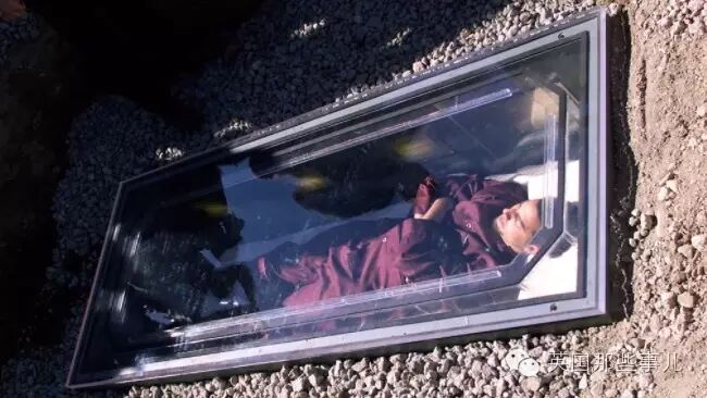 他躺進一個透明的棺材…