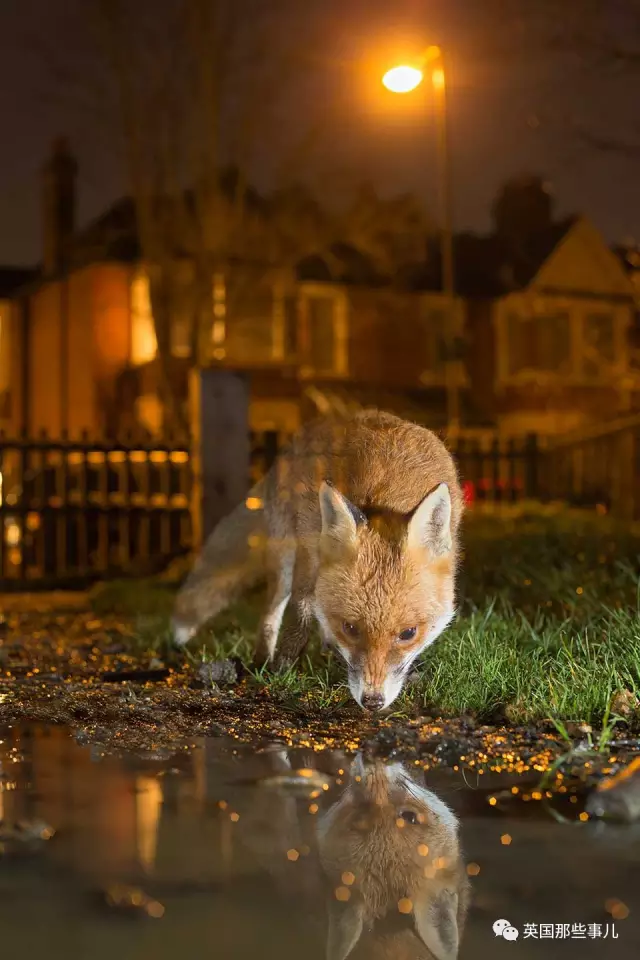 「倫敦公園喝水的狐狸「,Kyle Moore。