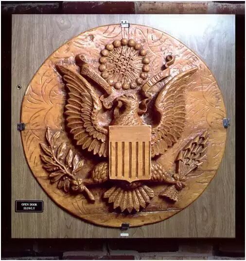 哈里曼大使對禮物愛不釋手,把國徽掛在了自己的書房牆上,這一掛就是7年。雖然期間換了幾任大使,國徽仍舊以其無與倫比的藝術美感贏得了大使們的鐘愛,甚至每位新大使到任后從墨水瓶到地板磚全部更換一新,但國徽卻始終安然無恙。巧妙地隱藏在老鷹鼻孔中的竊聽器,就這麼不動聲色地工作了7年。中情局很快便知,4位美國大使——埃夫里爾·哈里曼、沃爾特·史密斯、艾倫·科克和喬治·凱南的私人談話很有可能都被竊聽了。