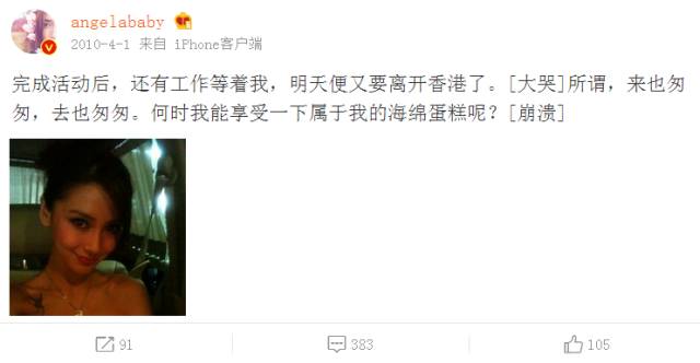 再說回baby和黃曉明哈,2010年4月,angelababy微博發了何時能享受一下屬於我的海綿蛋糕,科普一下,海綿蛋糕是小明大哥粵語諧音。
