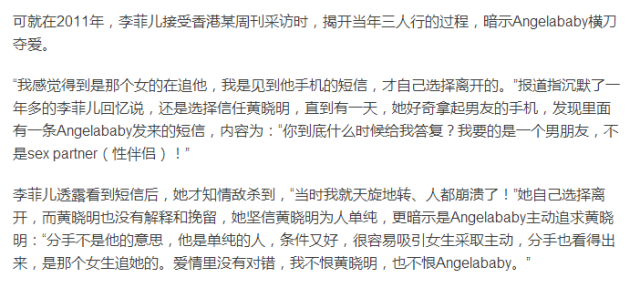 後來李菲兒和黃曉明分手后,還曾經提到過,有一次她無意中翻看黃曉明的手機,看到baby發來的一條簡訊:「你到底甚麼時候給我答覆?我要的是一個男朋友,不是sexpartner(炮友)」,那時候李菲兒才知道黃曉明出軌了,於是選擇退出。
