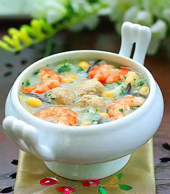 大米,水,野生黃刺魚一條,蝦100克,雞肉50克,乾貝10顆,蔥,姜適量,黃豆50克,新鮮肉丸5個,黑木耳50克,菠菜50克。