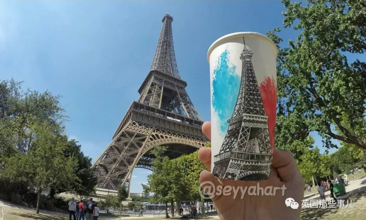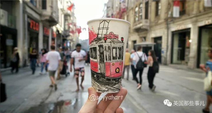 於是在旅途的空餘時間,在侯車等船,等飛機的空餘時間,Armagan便拿紙杯來,畫下他覺得最動人的畫面,有著名地標和景點、有路邊的美景、也有風土人情,還有各種創意……
