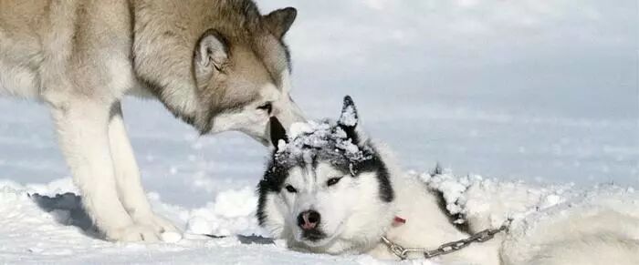 它們還在困境中相互溫暖,鼓勵。一條狗狗意外受傷,不能動彈,同伴拍拍它頭頂上的積雪,又俯身用自己的身體輕輕的抱住同伴的身體給它溫暖,安慰,不讓同伴獨受孤獨,寒冷。覓到食物放在同伴面前,四目相對,多麼溫暖和諧。