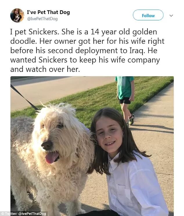 「我摸到了Snickers,它是一隻14歲的金毛。它是它主人在去伊拉克前送給他妻子的禮物,當時希望這個狗狗可以陪伴他的妻子。」