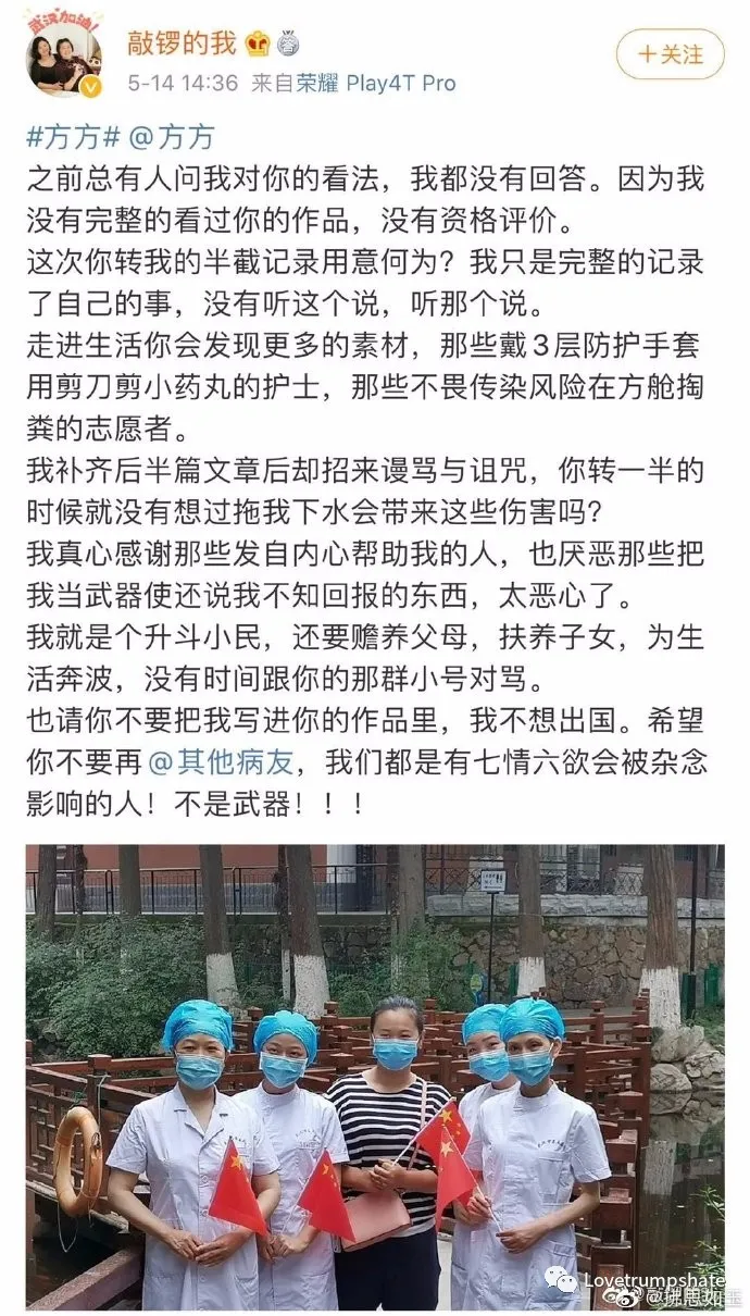 「用意何為」意指方方「用心險惡」,「我不想出國」意指方方是為了「出國」而寫作,她發博可以上下篇分開發,但方方卻不能分開轉,她發博不是拖自己下水,方方轉了就是拖她下水。這邏輯、這惡毒,與寫信的「高中生」、「大字報」農人、雷雷、錢詩貴比起來,只有更沒有最,看來這討方大軍的急先鋒她當定了。