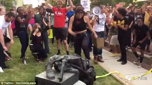 抗議者非法砸毀公共財物:北卡羅萊納州一座南北戰爭時期南方士兵雕像。讓我想起一句文革口號:「偷有理,搶無罪,革命的強盜精神萬萬歲!」